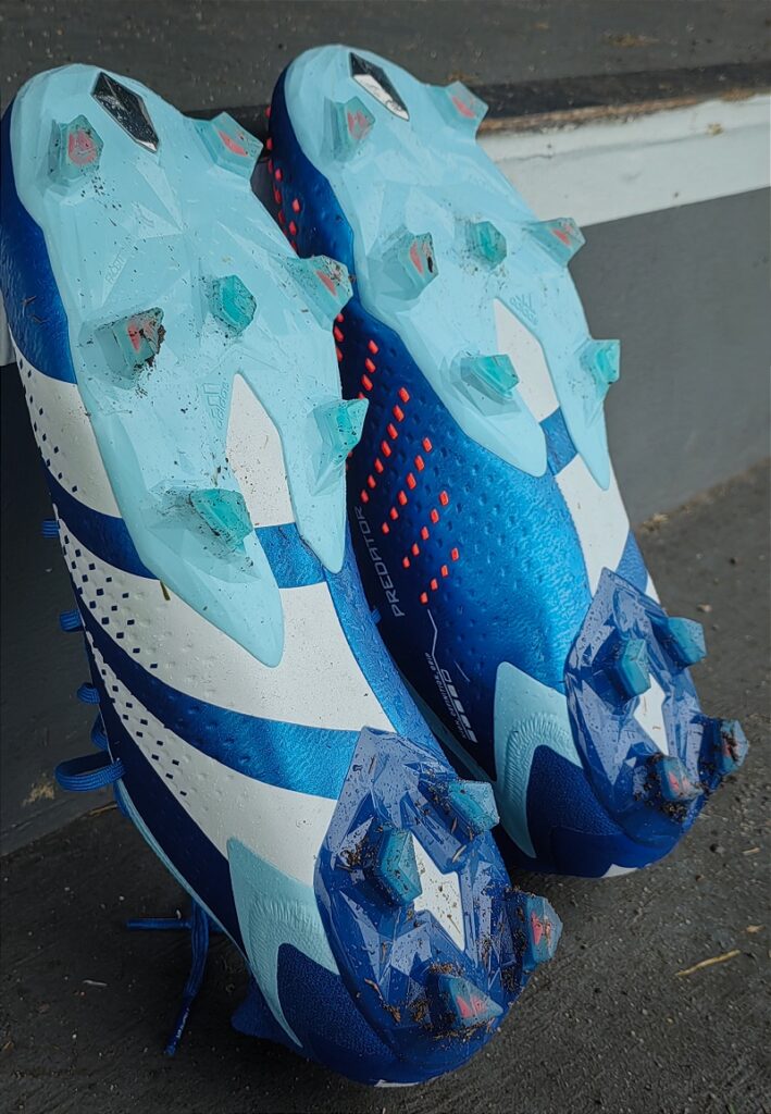 Those who follow the Predator boot line might recognise the stud pattern, as the soleplate and stud configuration from the Predator Edge is reapplied to the Accuracy. You get a fairly flexible and bendable toe-area, a stiffer midfoot for stability, and some smaller and longer triangular studs to make up the tooling. You do feel a little ‘elevated’ in the Accuracy.1 (likely due to the stability of the outsole), but it’s incredibly balanced with the shape and wide placement of the studs, giving you confidence that your ankles won’t be wobbling from side to side.