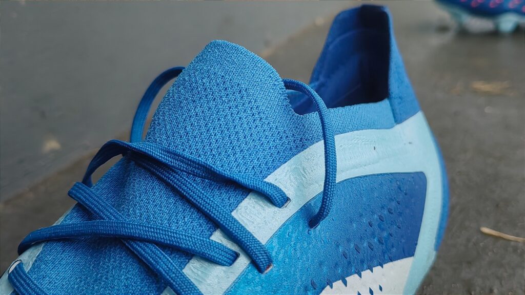 Design-wise, the Predator Accuracy.1 in the calming ‘Marine Rush’ colourway is an absolute stunner. The ocean-blue colourway looks fantastic on the upper, giving it a punchy look, but not overly garish. The knitted collar features a darker navy shade, which contrasts nicely with the core blue colour, and the orange accents on the 3D dots combined with the classic white stripes make this a stunning-looking boot.