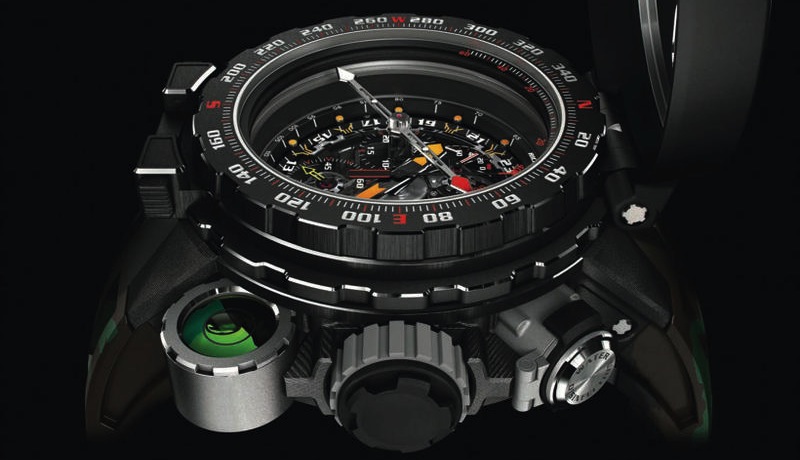 It features a compass bezel in case you get lost (in a forest with a bunch of AK-47-wielding baddies chasing you), has a spirit level (for when you need to make sure that your makeshift-tent is pristinely built), and even a compartment with 5 water purification tablets (for when you need safe drinking water in said forest). Oh, it also tells time – courtesy of a mechanical tourbillon movement with chronograph function, power reserve indicators for the movement, and other function indicators.