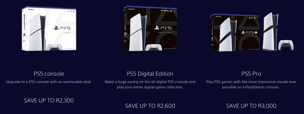 Beginning this Black Friday, you can save up to R2,600 on PS5 consoles, PS5 Digital Edition consoles, and PS5 Pro consoles. The offer also applies to console bundles including 30th Anniversary Limited Edition Bundles, EA Sports FC 26 Bundles, and Ghost of Yotei Gold Limited Edition Bundles.