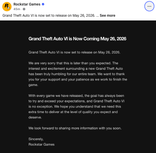 On a post on the Rockstar Games’ social media channels, the studio explained that the team require extra time to “deliver at the level of quality you expect and deserve.”