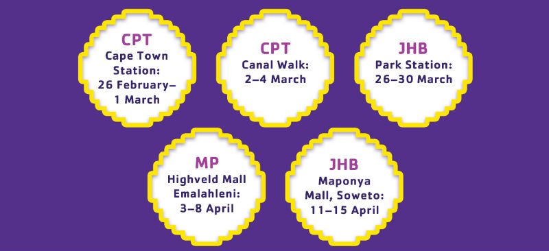 The Cadbury Wrapper Flapper will be making its way across the country, landing at Cape Town Station (26 February-1 March 2018), Canal Walk (2-4 March 2018), Johannesburg Park Station (26-30 March 2018), Highveld Mall in Mpumalanga (3-8 April 2018), and Maponya Mall (11-15 April 2018).