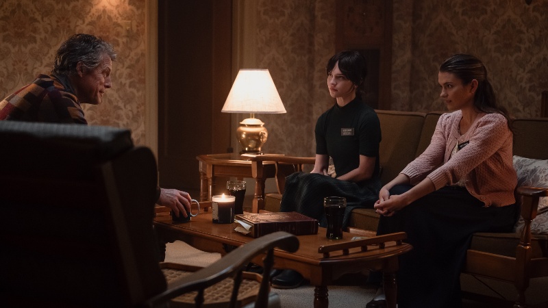 Grant isn’t Heretic‘s only remarkable performance though. The two wide-eyed missionaries – Reed’s hapless victims – are played by Sophie Thatcher (Yellowjackets) and Chloe East (The FabelmansThe Wolf of Snow Hollow). Crucially, both actresses were raised in the Mormon faith. “I think that was very useful for the film,” Grant said in his BAFTA interview, “because it made these two Mormon girls very complicated and three-dimensional, and not sort of glassy-eyed zealots, which would be much more boring.”