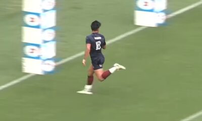 Kenki Fukuoka beats two players to speed to Japan's final try of the match as they beat Tonga 41-7 in the World Rugby Pacific Nations Cup.