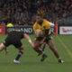 Powerful centre Samu Kerevi makes short work of Beauden Barrett.